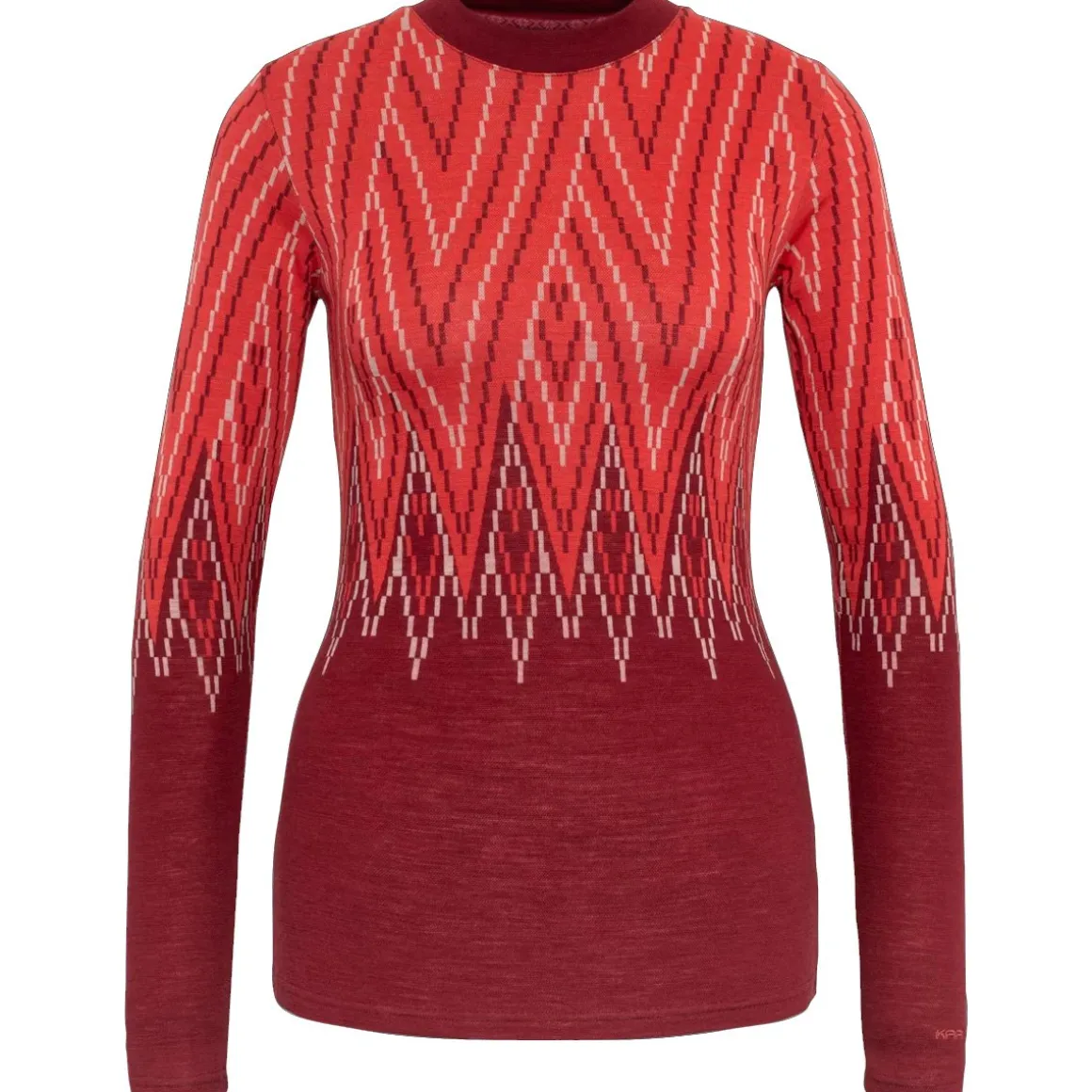 Denne langærmede trøje har en slim fit og er designet med et elegant Jacquard-strikmønster, som tilfører et retro-inspireret look. Materialet er naturligt åndbart og lugtafvisende, hvilket gør det ideelt til lange dage i kulden. Trøjens strækbare egenskaber og flade sømme sikrer en tæt, men bevægelig pasform, der ikke irriterer huden.