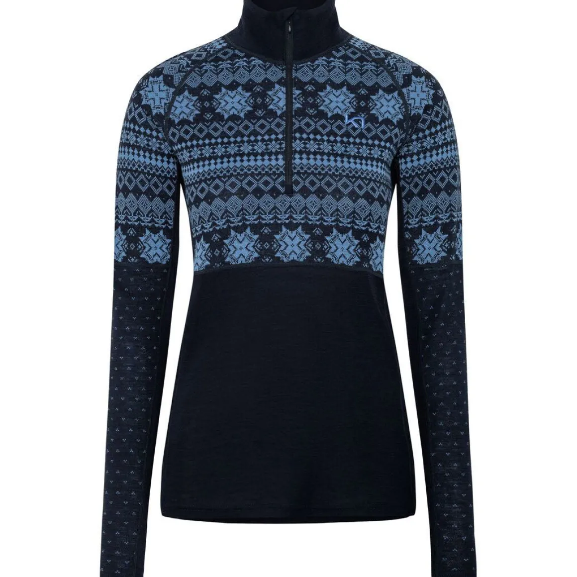 Med sin half-zip lynlås kan du nemt justere ventilationen under aktivitet, mens raglanærmer og strækbare underarmspaneler giver fuld bevægelsesfrihed. Det sneinspirerede jacquardstrik kombineres med en slim fit pasform, så du får et feminint og sporty look – både på ski, i naturen og til hverdagsbrug.