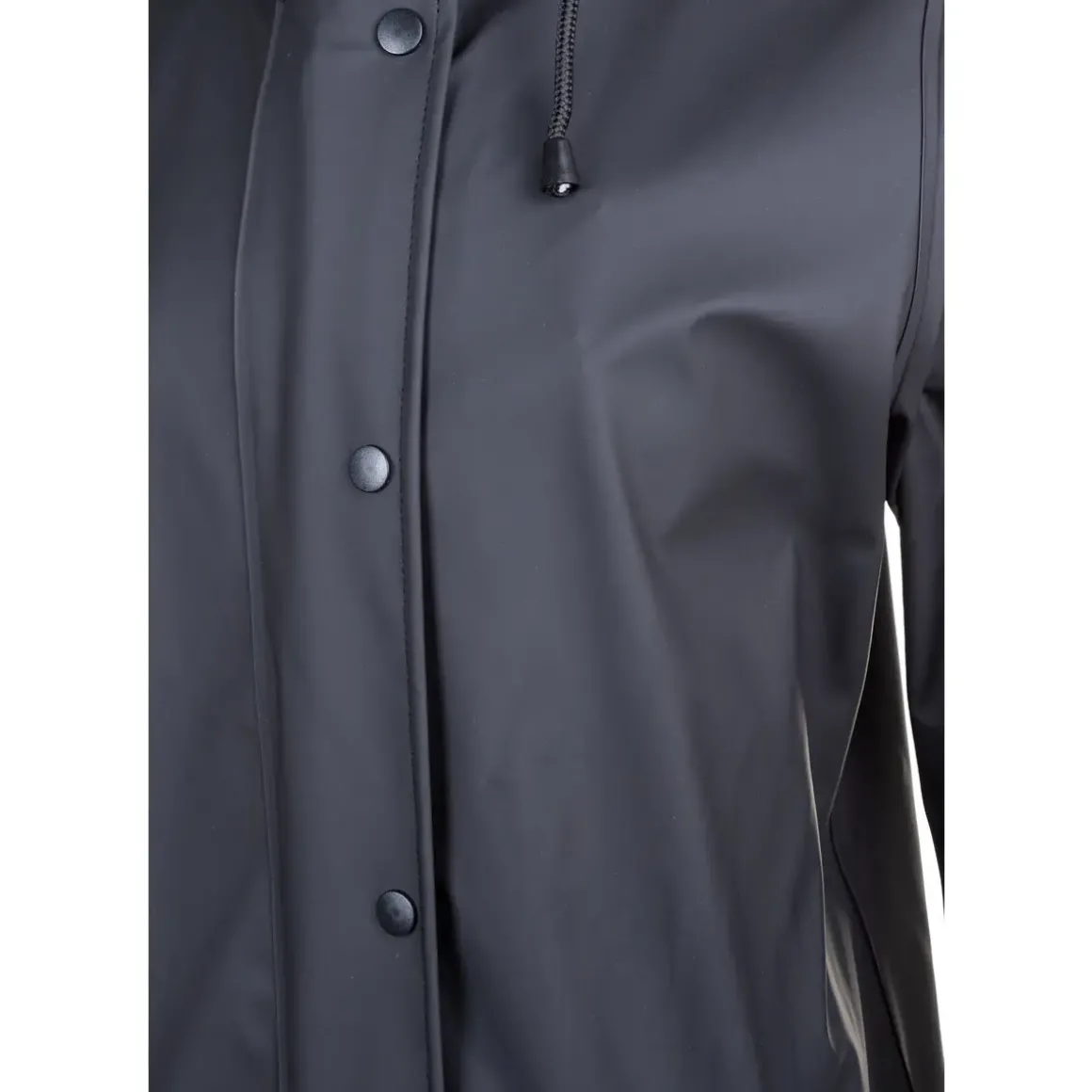 Enkel regnjakke som der er lavet med gennemgående lynlås og 2 lommer med “lapper”, så de også holder vandet ude.