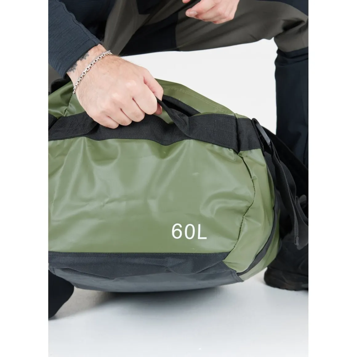 Rhorsh 60L duffelbag er udstyreret med justbart velcro-bærehåndtag og aftagelige skulderstropper, hvilket betyder, at den også kan bæres som en rygsæk. Små bærehåndtag i begge ender gør også transporten lettere. Hovedrum og inderlomme har lynlåse. Den forstærkede bund gør den særlig robust