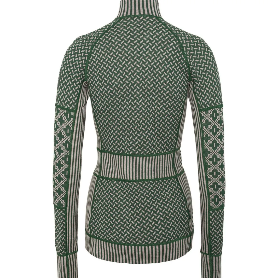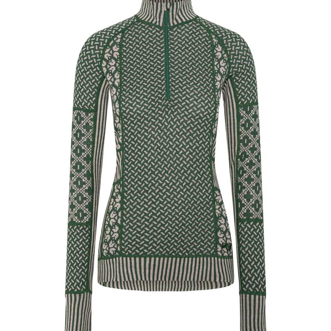 Det lette og åndbare materiale isolerer effektivt – selv i fugtig tilstand – og er naturligt lugtresistent, så du holder dig varm, tør og komfortabel hele dagen. Jacquardstrikkede paneler i forskellige mønstre giver et flatterende look, mens underarms-paneler og halv lynlås sikrer fuld bevægelsesfrihed og mulighed for ventilation.