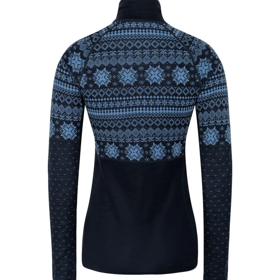 Med sin half-zip lynlås kan du nemt justere ventilationen under aktivitet, mens raglanærmer og strækbare underarmspaneler giver fuld bevægelsesfrihed. Det sneinspirerede jacquardstrik kombineres med en slim fit pasform, så du får et feminint og sporty look – både på ski, i naturen og til hverdagsbrug.