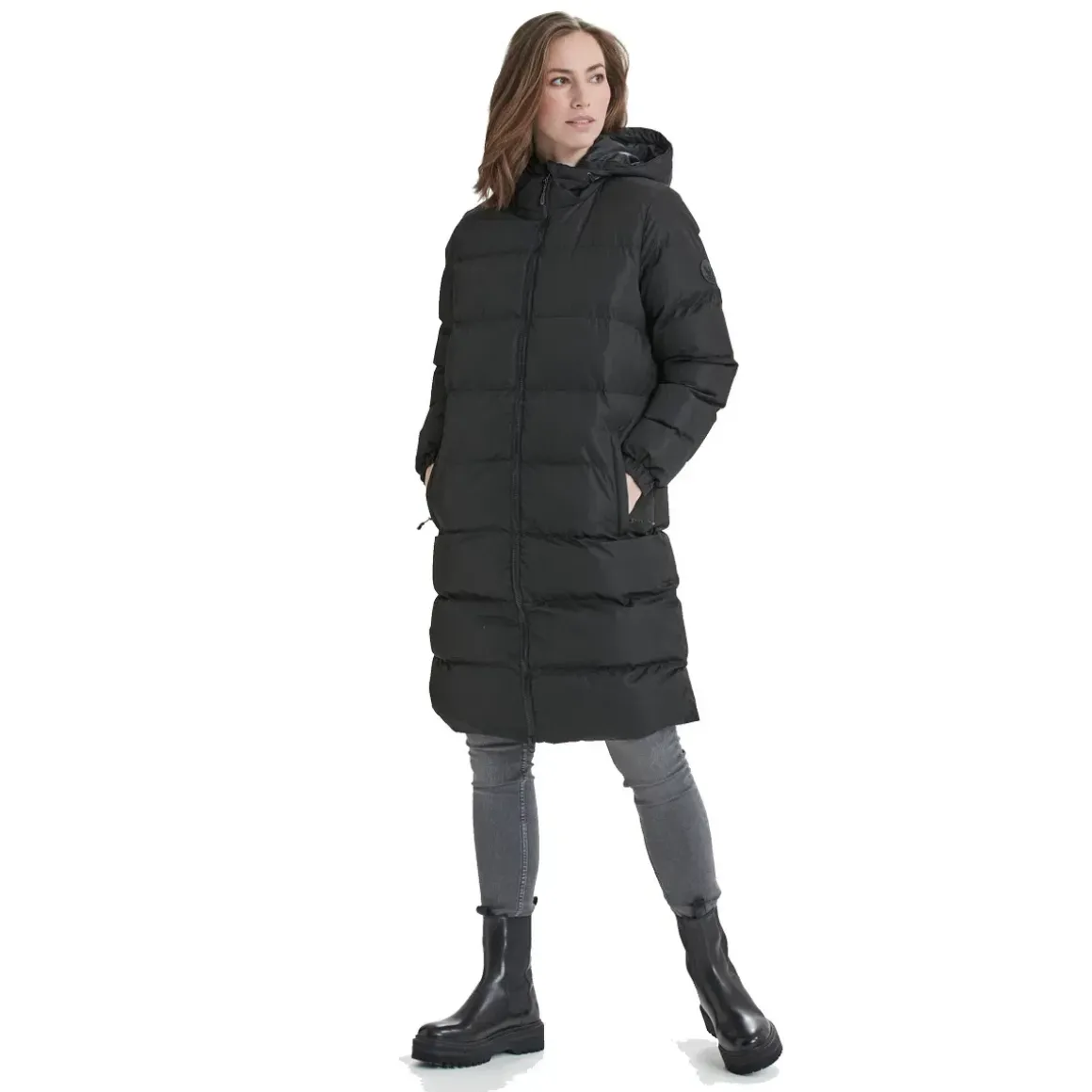 Den lange, polstrede konstruktion sikrer optimal varmeisolering, mens det vind- og vandafvisende ydermateriale beskytter mod vejret. Jakken har en justerbar hætte, lynlåslommer og en feminin pasform, der kombinerer funktionalitet med et moderne look. Med sit lette fyld og rummelige design er Abella-frakken ideel til både hverdagsbrug og udendørsaktiviteter, hvor komfort og varme er i fokus.